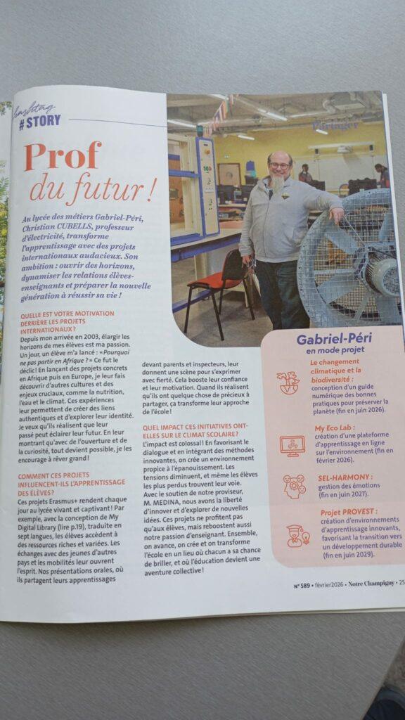 The article “Prof of the Future!” from the city magazine Notre Champigny (No. 589, February 2026) presents the work of Christian Cubells, an electricity teacher at Gabriel-Péri vocational school. The article explains his work with international and environmental school projects that help students learn in a different way.Through Erasmus+ projects and initiatives such as SEL, students learn about climate change, discover other cultures, and develop digital and social skills. These projects increase student motivation, improve the school climate, and make the school a place for innovative learning that is open to the world.