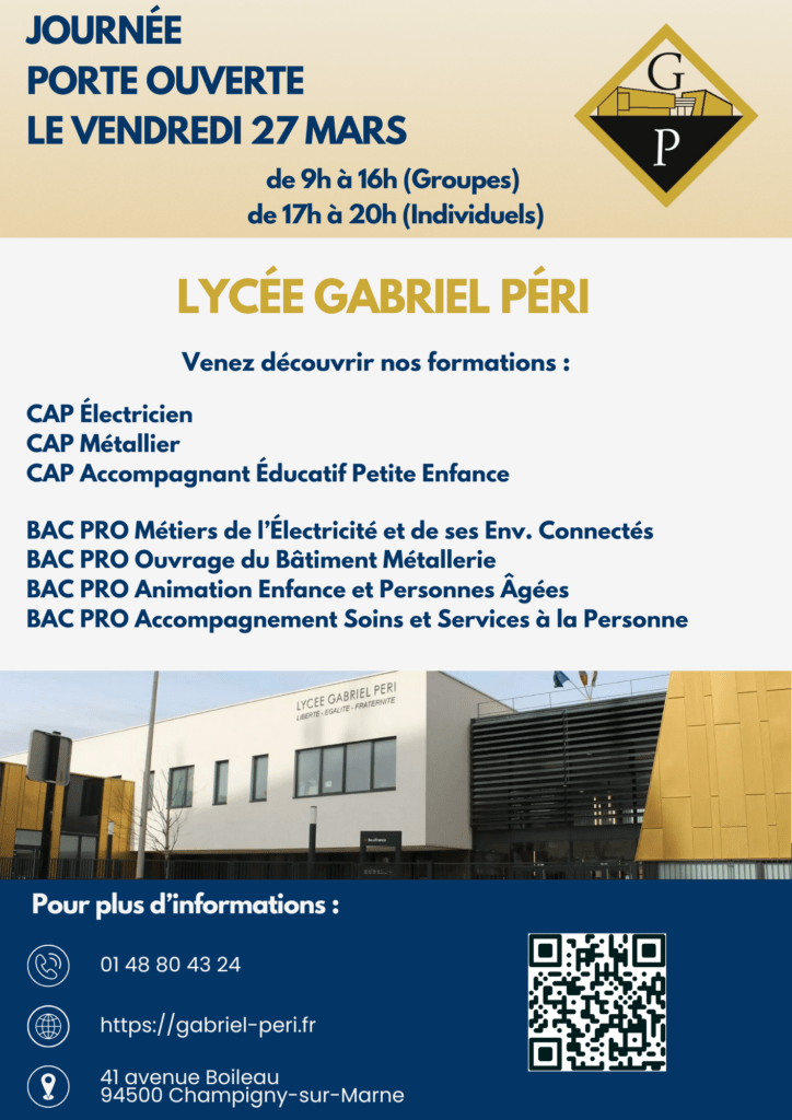 Le lycée Gabriel Péri ouvrira ses portes aux collèges de 9h à 16h puis aux familles de 17h à 20h le vendredi 27 mars.